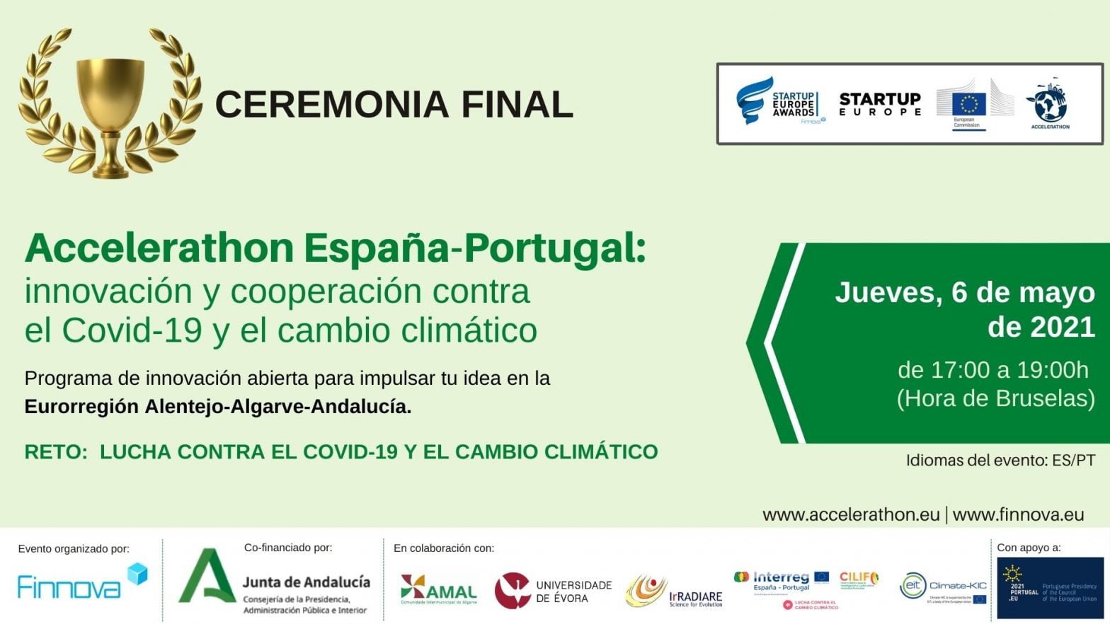 Sevilla, 28.04.2021 – El “Accelerathon España-Portugal: innovación y cooperación contra la Covid-19 y el cambio climático” trata de hacer frente a los retos que afronta la Eurorregión Alentejo-Algarve-Andalucía (Eurorregión AAA) en temas relacionados con la Covid-19 y el cambio climático. El próximo jueves, 06 de mayo de 2021 a las 17:00 (hora de Bruselas), se llevará a cabo la ceremonia final de este programa de innovación abierta (www.accelerathon.eu) para impulsar la innovación en la Eurorregión Alentejo-Algarve- Andalucía en materia de lucha contra el Coronavirus y el cambio climático. Esta iniciativa está cofinanciada por la Consejería de la Presidencia, Administración Pública e Interior de la Junta de Andalucía.