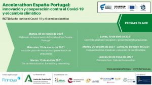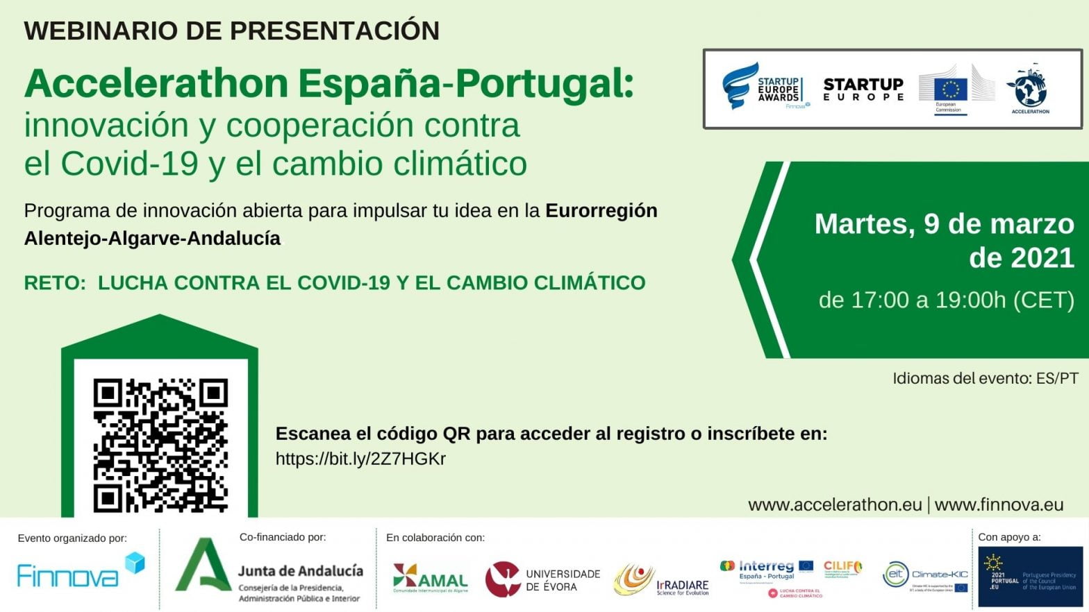 El próximo martes, 09 de marzo de 2021 de 17:00 a las 19:00 (CET), se presentará este programa de innovación abierta (www.accelerathon.eu) para impulsar la innovación en la Eurorregión Alentejo-Algarve- Andalucía en materia de lucha contra el Coronavirus y el cambio climático. En el webinario se tiene prevista la participación de las entidades que colaboran con Finnova en esta iniciativa (Universidad de Évora, IrRADIARE y la Comunidad Intermunicipal del Algarve-AMAL) para la realización e implementación de las tareas incluidas en la celebración del “Accelerathon España-Portugal: innovación y cooperación contra la Covid-19 y el cambio climático”.