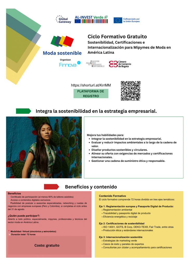 Esta formación tiene como objetivo fortalecer las capacidades del ecosistema de la moda en Colombia y Perú, ayudando a las empresas a incorporar la sostenibilidad en sus estrategias, reducir impactos ambientales, diseñar productos circulares y cumplir con los estándares internacionales requeridos por los mercados globales, especialmente el europeo.