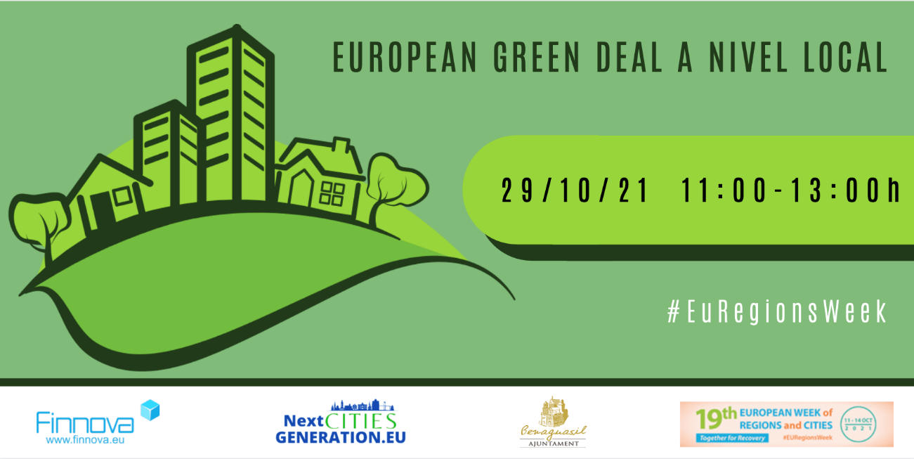 El próximo viernes, 29 de octubre, de 11h00 a 13h00 CEST, el municipio valenciano de Benaguasil acogerá el evento “European Green Deal a nivel local”, un acto que ahondará en el Pacto Verde Europeo desde su nivel más cercano de actuación, los municipios, tan importantes para la consecución de los objetivos europeos. Organizado en el marco de la Semana Europea de las Regiones y Ciudades, contará con el apoyo de la Fundación Finnova.