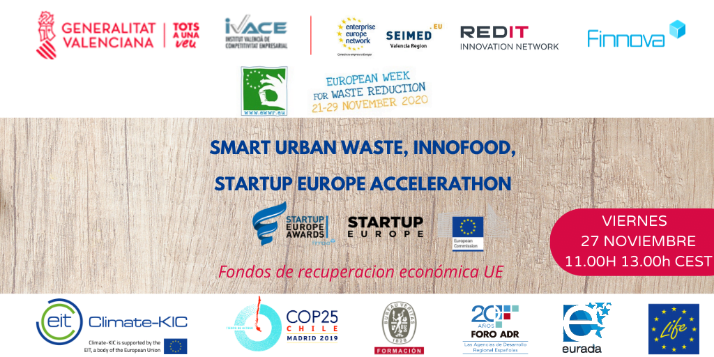 Bruselas, 30.11.2020. El pasado viernes 27 de noviembre se ha celebrado el “Smart Waste Startup Europe Accelerathon (Urban Waste & Innofood)”, un webinar online organizado por la Fundación Finnova, en colaboración con IVACE, SEIMED y REDIT. Este evento se ha organizado bajo el paraguas de la Semana Europea para la Reducción de Residuos o European Week for Waste Reduction (EWWR), que trabaja con la jerarquía de residuos, promoviendo la reducción del consumo, la reutilización de productos y materias, así como el reciclaje de residuos.