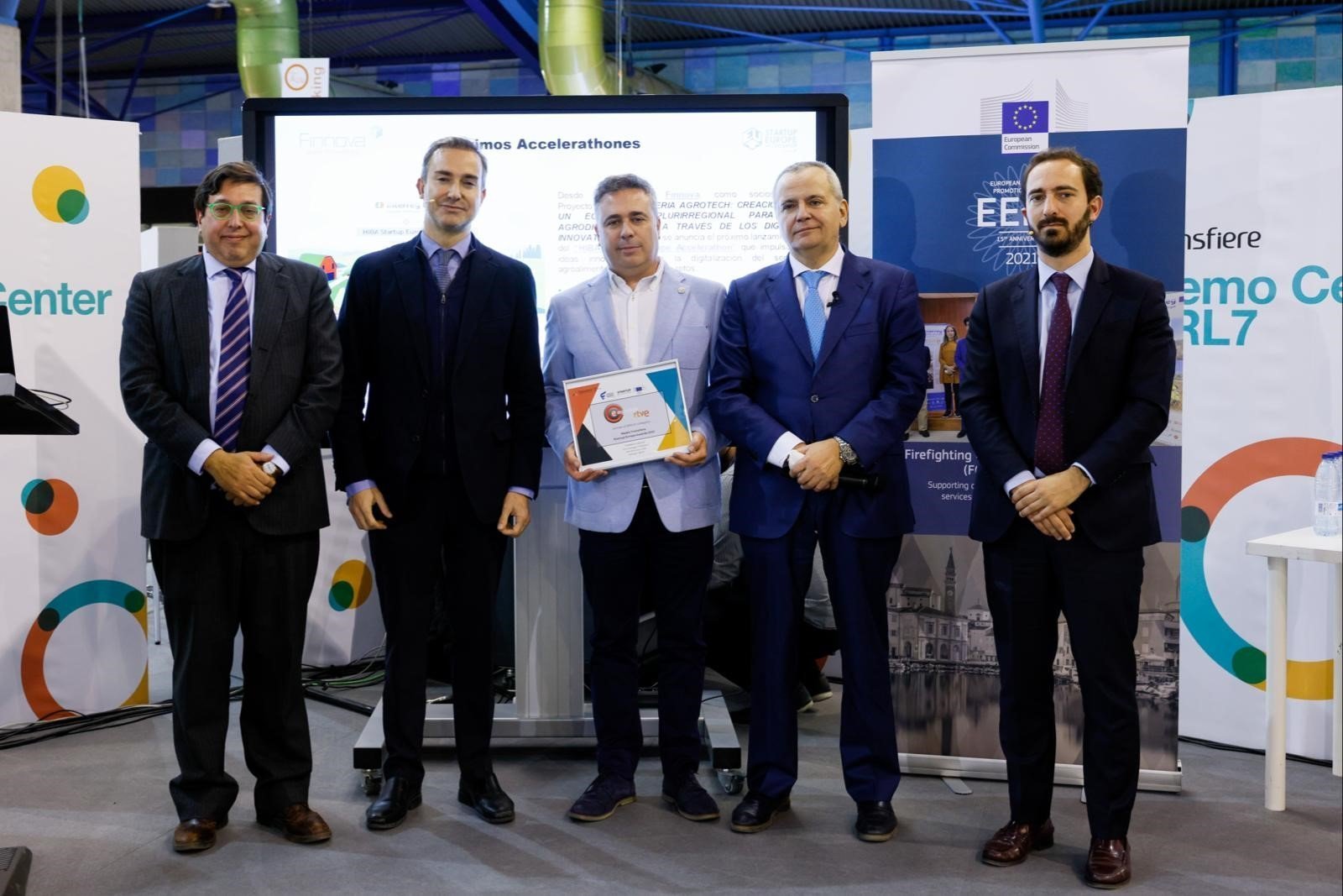 Málaga,17 de febrero de 2022- El programa Emprende TVE emitido por el Canal 24 horas recibió el miércoles 16 de febrero, el Premio Media Transfiere Startup Europe Awards 2022 en el Foro Europeo para la Ciencia, Tecnología e Innovación. El director del Programa, Juanma Romero y el realizador Luis Olivan recibieron el premio europeo de manos de Amós García Hueso, Secretario General de la Agencia de Gestión Agraria y Pesquera de Andalucía, y Jordi Llinares, Subdirector General de Digitalización de la Industria y Entornos Colaborativos y responsable de los Digital Innovation Hubs en el Ministerio de Industria, Comercio y Turismo.