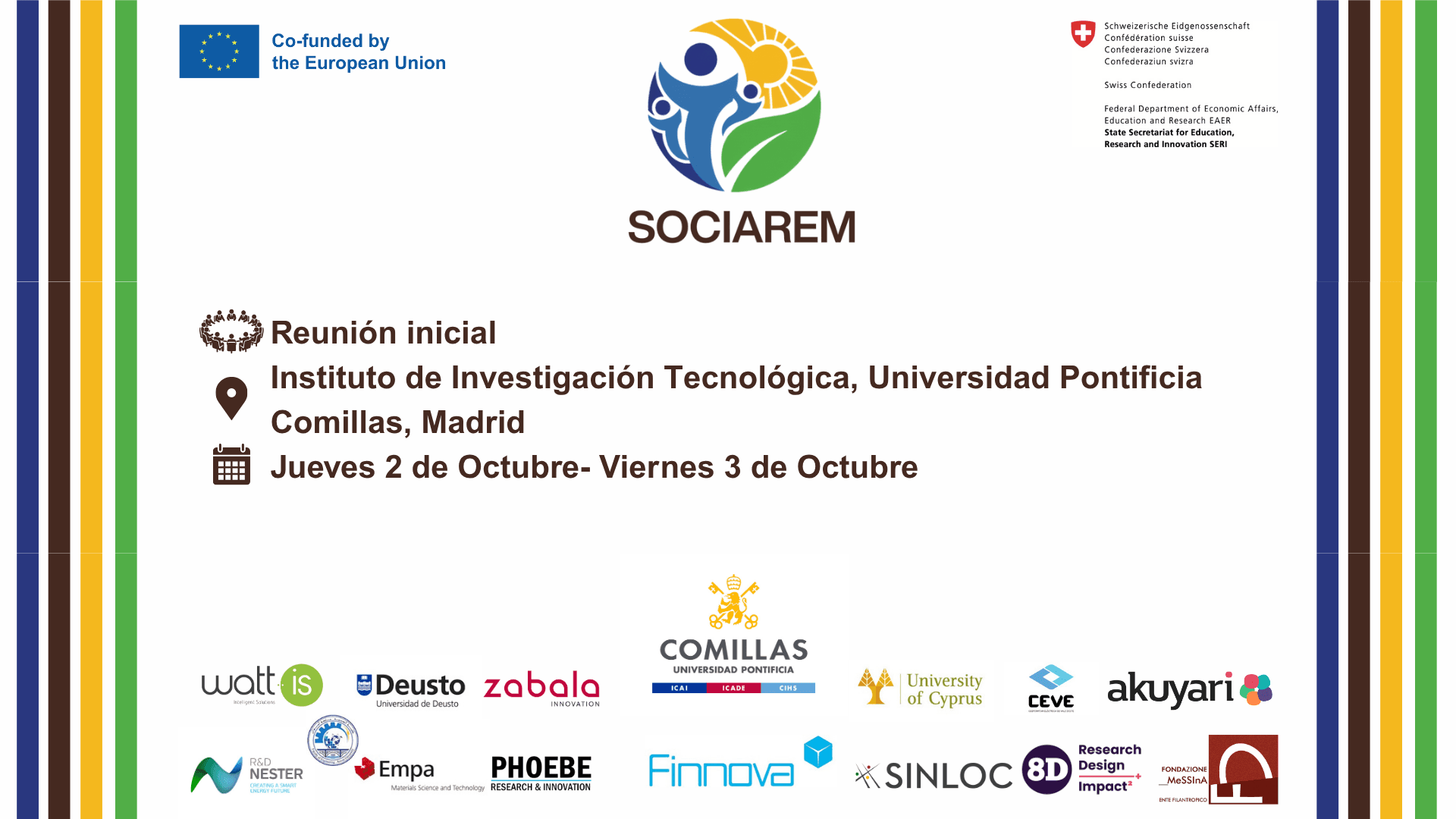 Madrid, 1 de octubre de 2025. El proyecto europeo SOCIAREM comenzará oficialmente con una reunión del consorcio el 2 (jueves) y 3 (viernes) de octubre de 2025 en Madrid, España. Cofinanciado por el programa Horizon Europe programme de la Unión Europea y la Secretaría Suiza de Educación e Investigación, SOCIAREM reúne a un consorcio multidisciplinario de 15 socios de 9 países para acelerar la adopción de sistemas fotovoltaicos (PV) y modelos de intercambio de energía abordando las barreras sociales, regulatorias, técnicas y económicas.