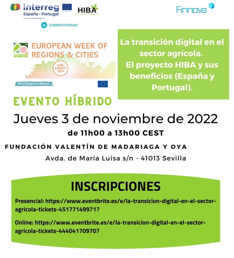 En el marco de la Semana Europea de las Regiones y Ciudades, el Proyecto Hub Iberia Agrotech (HIBA) organiza un evento paralelo el jueves 3 de noviembre de 2022, de 11h00 a 13h00 (hora de Madrid) bajo el título La transición digital en el sector agrícola. El proyecto HIBA y sus beneficios (España y Portugal).