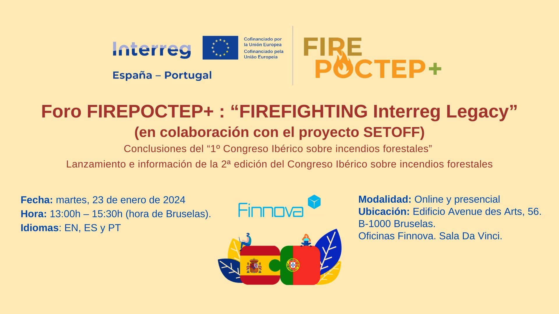 El martes, 23 de enero de 2024, de 13:00h a 15:30h (hora de Bruselas), tendrá lugar el “Foro FIREPOCTEP+: Firefighting Interreg Legacy”, en el que se tratarán las conclusiones del “1º Congreso Ibérico sobre incendios forestales” y se informará sobre la “2ª edición del Congreso Ibérico” sobre incendios forestales.