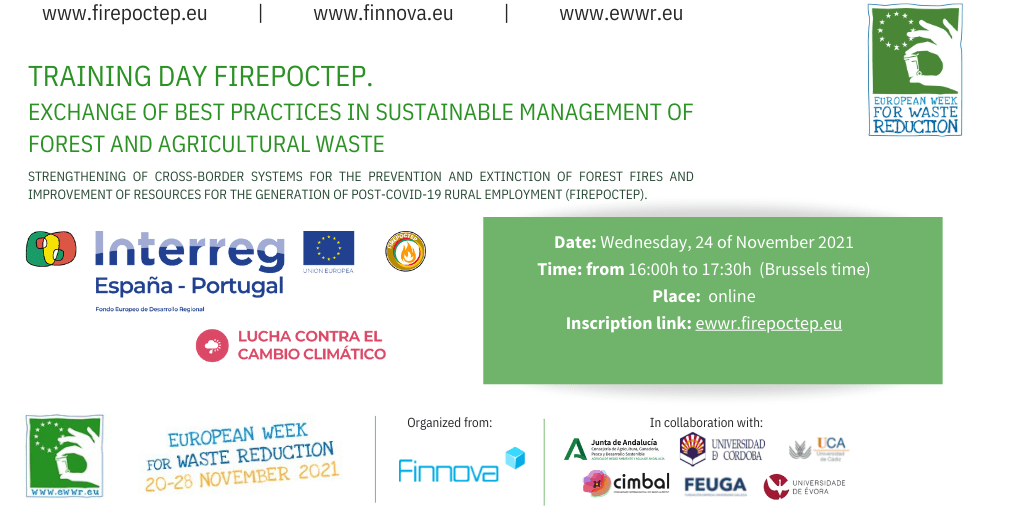 Next Wednesday, 24 November 2021, from 4 p.m. to 5.30 p.m. (CET), the online event “FIREPOCTEP Training Day. Exchange of good practices in sustainable management of forestry and agricultural waste” will be held. It is organised by the Finnova Foundation in the framework of the European Week for Waste Reduction. This event aims to show solutions for improving waste management in forestry and agriculture in order to reduce the risk of forest fires and their effects in the Raya area (border between Spain and Portugal).