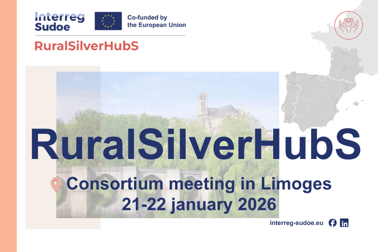 Partners of the European project Interreg Sudoe RuralSilverHubS will gather in Limoges (Nouvelle-Aquitaine, France) on Wednesday 21st and Thursday 22nd, January 2026, for a two-day consortium meeting and series of workshops aimed at advancing innovative responses to ageing, depopulation and service accessibility challenges in rural areas.