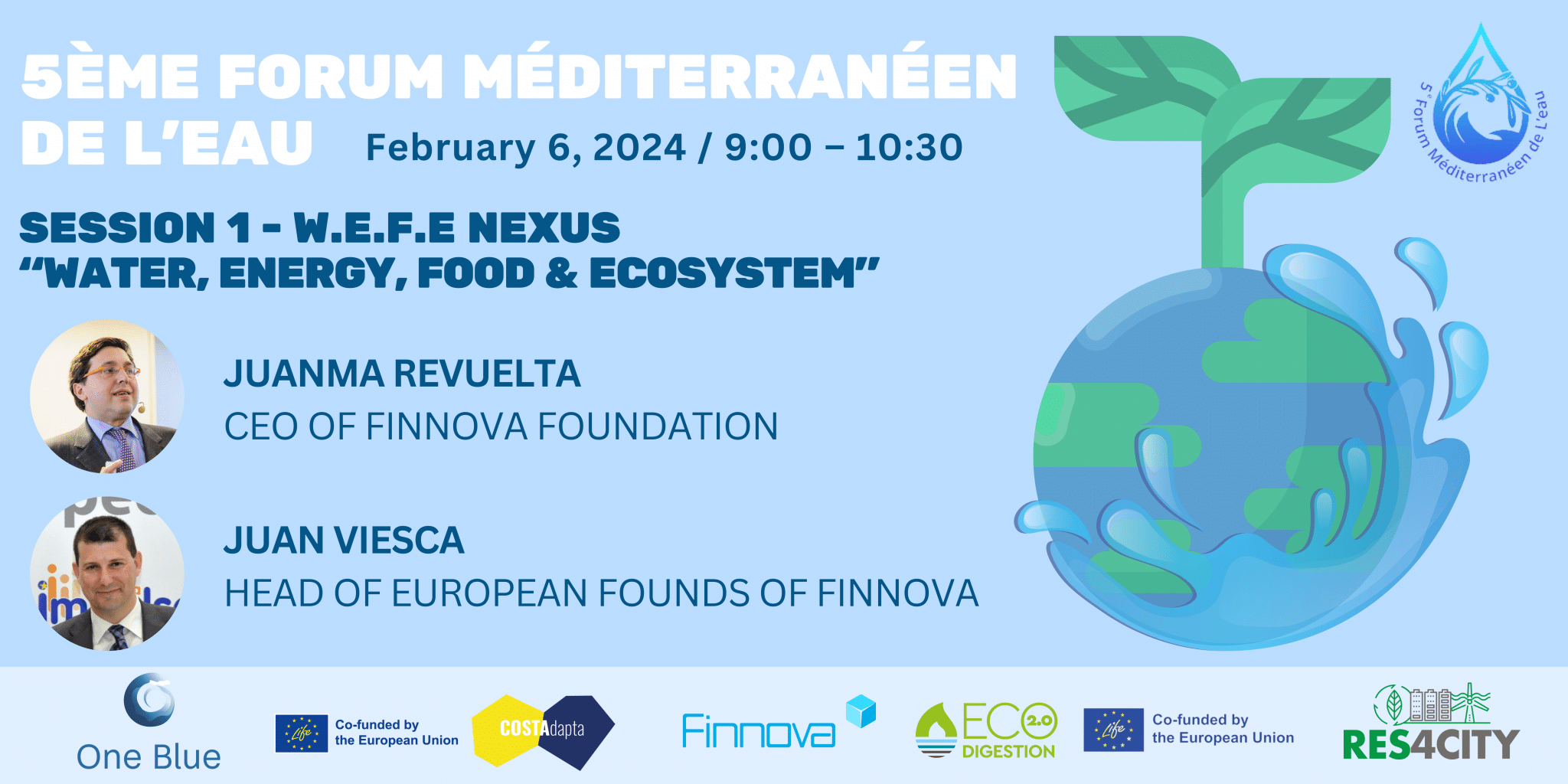 Finnova will have a stand to showcase projects related to water management and protection, and on Tuesday, February 6 from 9:00 to 10:30 am (CET), will participate in the session “WEFE Nexus: Water/Energy/Food/Environment”. Finnova Foundation CEO Juanma Revuelta and European Funds Director Juan Viesca will present a total of 4 projects: LIFE ECOdigestion 2.0, Horizon ONE-BLUE, Horizon RES4CITY and LIFE COSTAdapta.