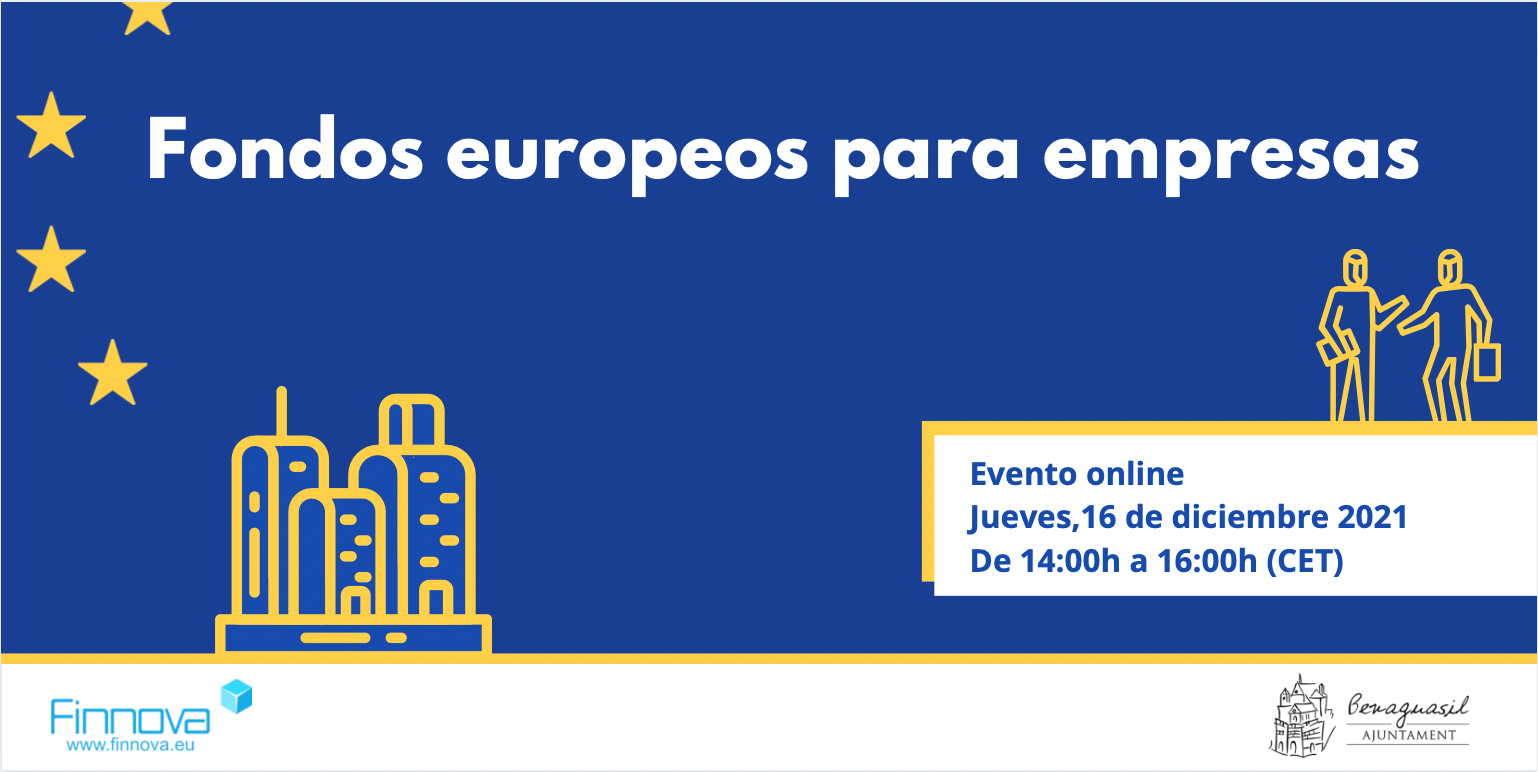 El próximo jueves 16 de diciembre de 2021 de 14.00 horas a 16.00 horas (CET) se celebrará la jornada online “Fondos europeos para empresas”. En este webinario, organizado por el Ayuntamiento de Benaguasil y la Fundación Finnova, se presentarán las distintas opciones de financiación dentro del ámbito institucional y financiero europeo enfocado a proyectos e iniciativas de empresas y startups.