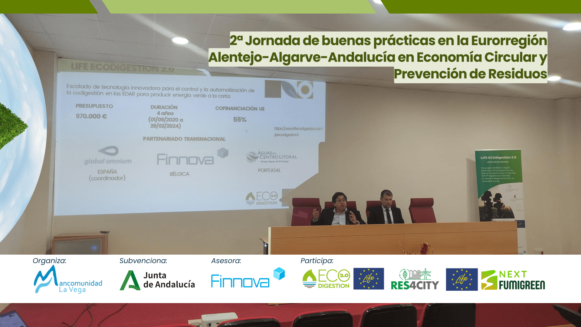 El pasado miércoles 31 de mayo, el Complejo Medioambiental de La Vega, situado en el término municipal de Alcalá del Río en Sevilla, acogió la 2ª Jornada de buenas prácticas en la Eurorregión Alentejo-Algarve-Andalucía en Economía Circular y Prevención de Residuos. Este evento, subvencionado por la Junta de Andalucía, contó con el asesoramiento de la Fundación Finnova y participaron proyectos como LIFE ECODigestión 2.0., LIFE NextFUMIGREEN y Res4city.