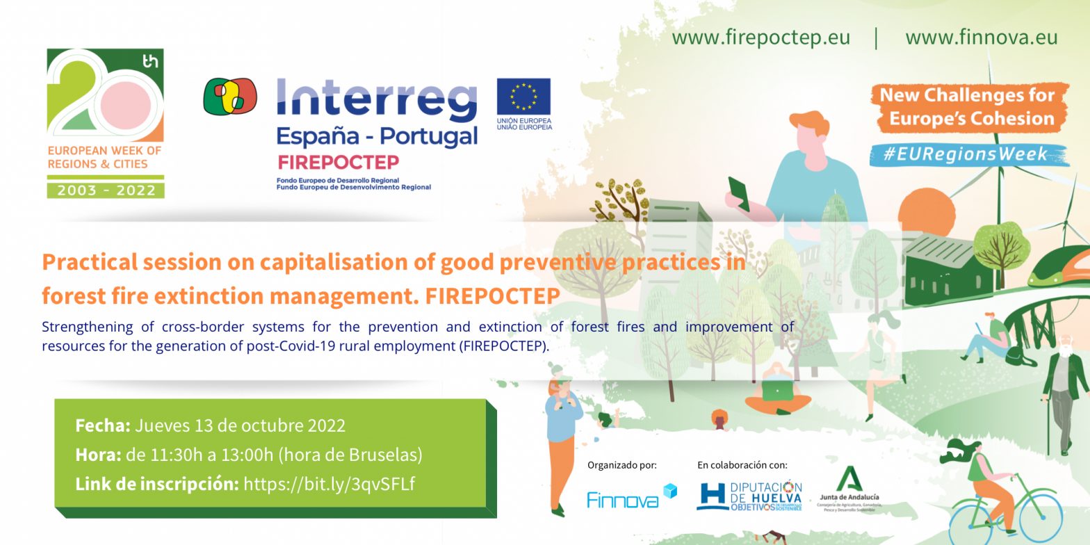 16.09.2022. El próximo jueves, 13 de octubre de 2022, de 11h 30 a 13h00 (hora de Bruselas), el Proyecto FIREPOCTEP estará presente en la Semana Europea de las Regiones y Ciudades. La Fundación Finnova, en colaboración con la Consejería de Agricultura, Pesca, Ganadería y Desarrollo Sostenible de la Junta De Andalucía y la Consejería de Agricultura, Desarrollo Rural, Población y Territorio de la Junta de Extremadura, organiza un evento online sobre la capitalización de buenas prácticas preventivas en la gestión de la extinción de incendios forestales.