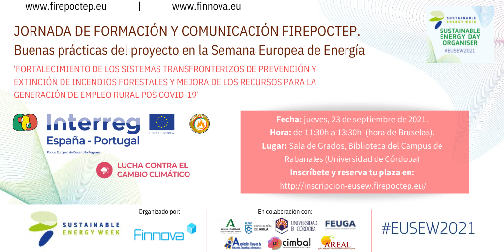 El proyecto Interreg FIREPOCTEP celebrará través de la Fundación Finnova, como una de las entidades beneficiarias del proyecto, el próximo viernes, 23 de septiembre de 2021, un evento en el marco de la Semana Europea de la Energía Sostenible (EUSEW), el mayor evento dedicado a las energías renovables y su uso eficiente en Europa.