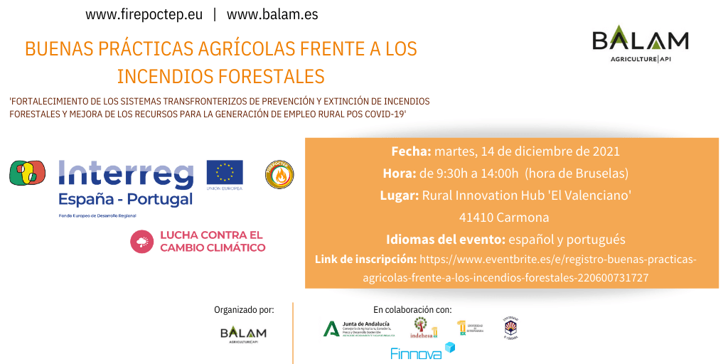 El pasado martes 14 de diciembre tuvo lugar una jornada formativa sobre “Buenas prácticas agrícolas frente a los incendios forestales” con el subtítulo: “Fortalecimiento de los sistemas transfronterizos de prevención y extinción de incendios forestales y mejora de los recursos para la generación de empleo rural post COVID-19” llevada a cabo por la Asociación de Producción Integrada de BALAM con la colaboración de Fundación Finnova, en el marco del Proyecto FIREPOCTEP en la finca Rural Innovation Hub El Valenciano, en la localidad sevillana de Carmona.