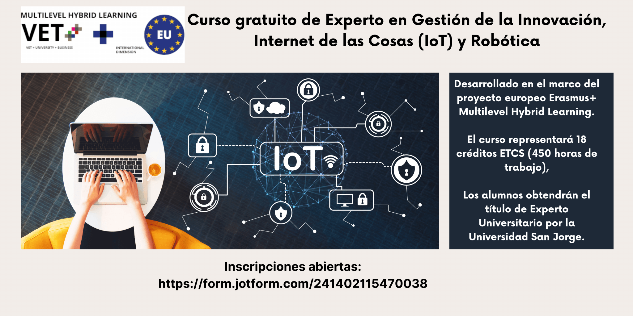 La Fundación Finnova iniciará, a finales del mes de mayo, el curso gratuito de Experto en Gestión de la Innovación, Internet de las Cosas (IoT) y Robótica, desarrollado en el marco del proyecto europeo Erasmus+ Multilevel Hybrid Learning. La realización de este curso, que representará 18 créditos ETCS (450 horas de trabajo), permitirá a los alumnos obtener el título de Experto Universitario por la Universidad San Jorge.