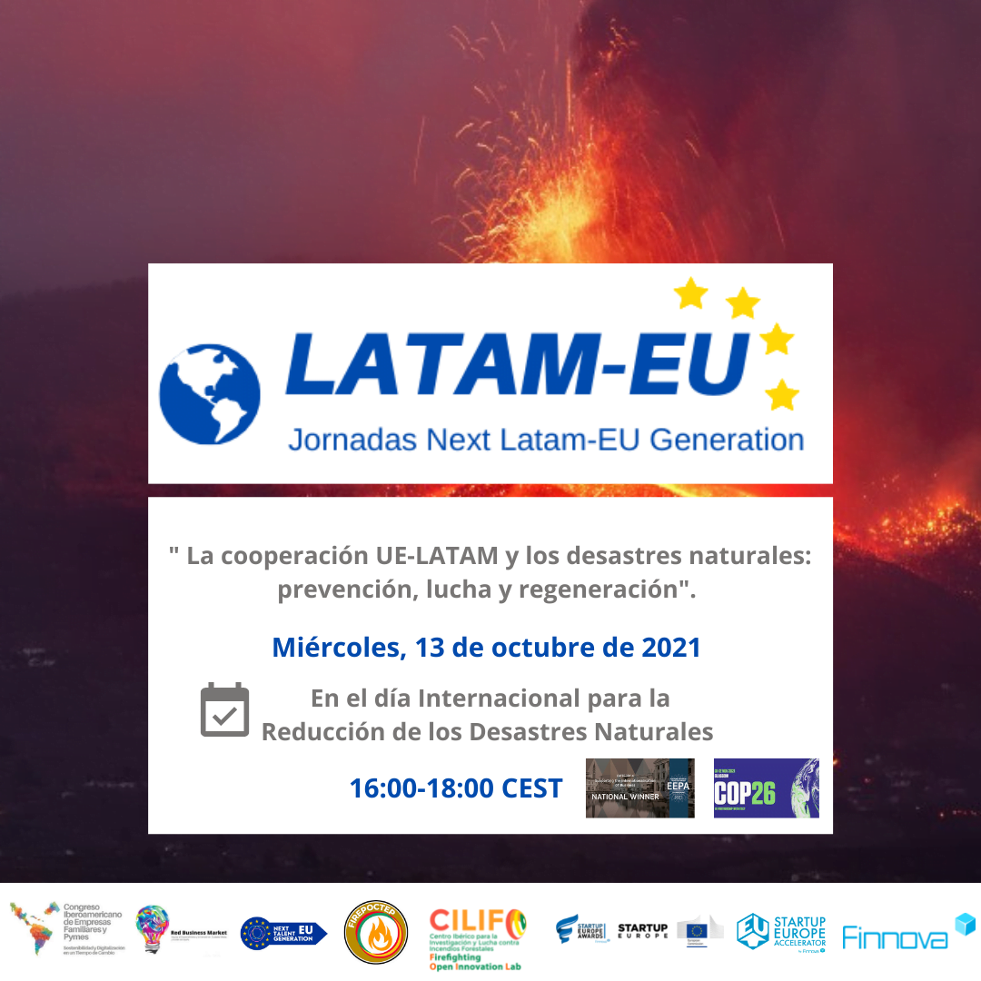 La séptima jornada de NEXT LATAM-EU GENERATION “La cooperación UE-LATAM y los desastres naturales: prevención, lucha y regeneración” celebrada en el Día Internacional para la Reducción de los Desastres Naturales destacó la importancia de la cooperación, solidaridad e innovación para mitigar los efectos del cambio climático que producen desastres naturales. La puesta en contexto de la tragedia de La Palma en Canarias, las más de 510 mil muertes registradas en los últimos 50 años por desastres naturales vinculados al cambio climático en América Latina, así como las pérdidas económicas de terremotos en Haití o Chile e inundaciones y sequías ocasionadas por el fenómeno del Niño, fueron algunos de los desastres expuestos durante este acto.