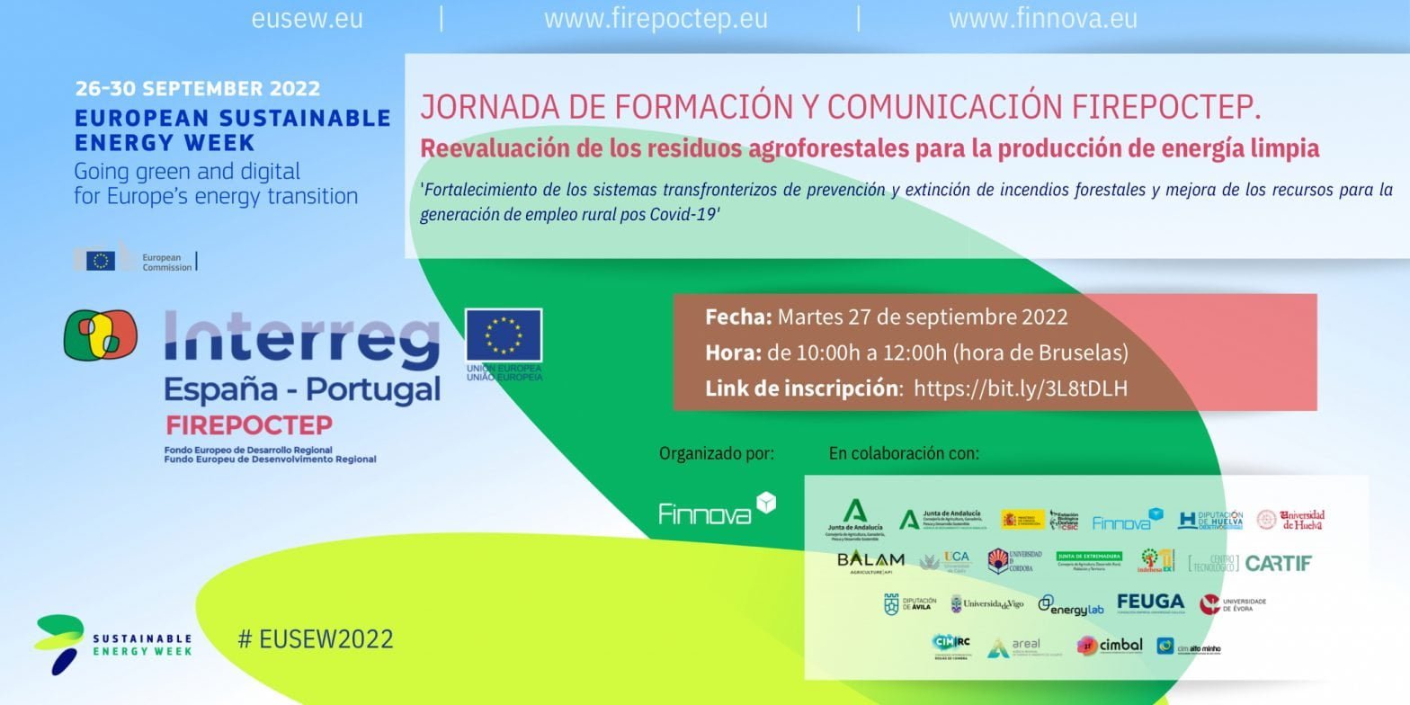19.09.2022. FIREPOCTEP participa en la Semana Europea de la Energía Sostenible el próximo martes, 27 de septiembre de 10:00 a 12:00 horas (hora de Bruselas), a través la Fundación Finnova. Se trata de un evento sobre la “Revalorización de los residuos agroforestales para la producción de energía limpia”, con el objetivo de debatir la capitalización y buenas prácticas en valorización energética sostenible.