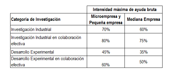 La ayuda consistirá en una subvención a fondo perdido que se determinará como un porcentaje de los costes del proyecto individual de I+D, y podrán abarcar la creación de nuevos productos o funcionalidades de productos existentes cuya ejecución lleve asociado un avance científico o tecnológico. Los proyectos de I+D de TIC deberán aplicarse a los ámbitos de Industria 4.0, Internet del Futuro y soluciones para la vida independiente. La intensidad máxima de la ayuda es la siguiente:
