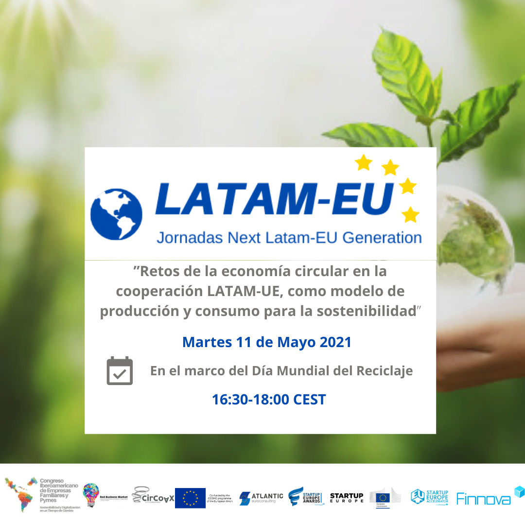 Bruselas, 03.05.2021 – El martes 11 de mayo de 2021 con motivo del Día Mundial del Reciclaje, la Fundación Finnova y Startup Europe Awards lanzan la tercera jornada del ciclo Next LATAM-EU Generation: Retos de la economía circular en la cooperación LATAM-UE como modelo de producción y consumo para la sostenibilidad, con la colaboración de la Red Business Market y el Congreso Iberoamericano de Empresas Familiares y Pymes.